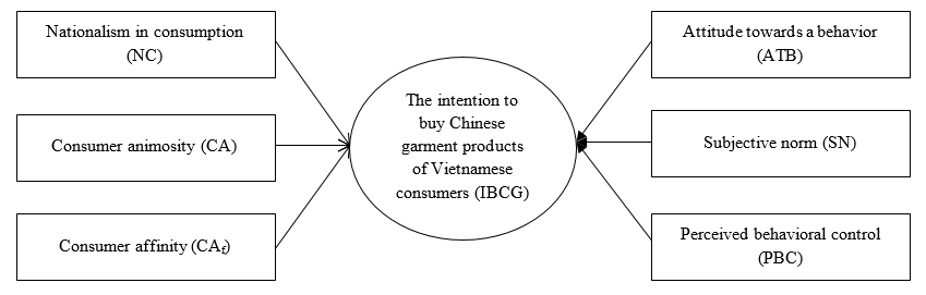 The paper aims to investigate the determinants influencing Vietnamese Consumers' Intention for buying Chinese Garment Products. Six main factors in this study including, (i) Nationalism in consumption (NC), (ii) Consumer animosity (CA), (iii) Consumer affinity (CAf), (iv) Attitude towards a behavior (ATB), (v) Subjective norm (SN), (vi) Perceived behavioral control (PBC). Data of the research was collected from a survey of 600 Vietnamese Consumers in Ho Chi Minh and Hanoi City who have bought Garment Products. Firstly, by using the quantitative research method Exploratory Factor Analysis and Cronbach’s Alpha, the research shows that 6 factors influence Vietnamese Consumers' Intention for buying Chinese Garment Products. Secondly, the regression analysis among variables shows that influencing level clarity of the factors on Vietnamese Consumers' Intention for buying Chinese Garment Products. Therefore, the empirical findings show that Vietnamese consumers' Intention for buying Chinese Garment Products has a mediating role in the relationship between domestic garment enterprises. The results of this study propose that managers need to focus on investing and researching to understand customers' attitudes towards competitors' products better, thereby they can proactively develop marketing programs to positively influence customers' buying behavior. Also, this paper provides new insight into the Vietnamese Consumers' Intention for buying Chinese Garment Products.