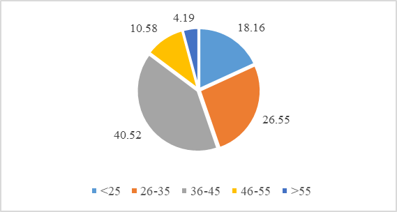 Among 501 surveyors (Figure 1), people from the age group of 37-45 years old take the biggest portion (40.52%), whereas people who are older than 55 take the smallest portion (4.19%). The age group of 37-45 stands at only 10.58% whilst the 26-35 age group takes up to 26.55%, and <25 age group is 18.16%. As above, people age 36-45 are the reason why the number of married people accounts for such a large percentage among the participants. The major ages also bring higher reliability to the survey results, because middle-age people have a stable income and idle money to invest. Regardless of marital status, ones having free money will become potential customers of the P2P lending model.