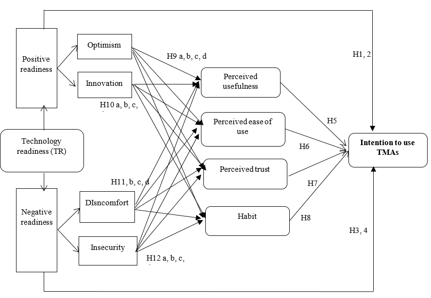 Recent studies have shown that habitual behaviors quickly emerge in response to activating cues without supervision, including perceptions of ease of use and usefulness (Neal et al., 2011). According to Kamboj and Joshi (2021), a key factor in determining a smartphone user's inclination to use an application and how loyal they are to travel-related applications is their habit of utilizing technological applications. Additionally, trust is an important consideration when determining the desire to use smartphone apps for travelers (Gupta et al., 2018), social media platforms, shopping on mobile devices and compensation (Gupta & Arora, 2020) and banking mobile services and applications (Alalwan et al., 2017; Jabbar et al., 2021). Trust also affects the intention to purchase online (Vieira et al., 2020) and is specific to individual technology trust. Therefore, based on the above arguments, the following hypotheses regarding the influence of technology acceptance on the intention to use technology-mediated applications (TMAs) among Generation Z in Vietnam can be proposed.