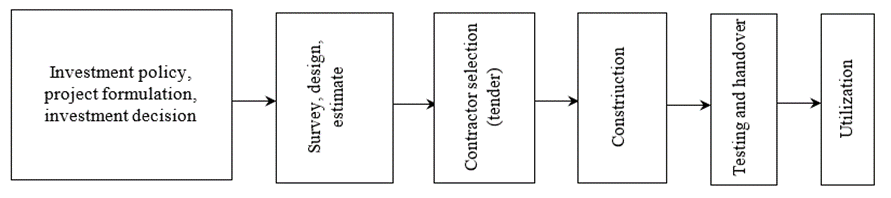 Products of the industrial infrastructure include tangible products (internal roads, electricity supply network, water supply, telecommunications services, wastewater treatment works...) and intangible products (training), public administrative services, security, culture...). These products are formed and developed through construction investment projects. Investment projects are implemented through a continuous process from investment policy to design, bidding, construction, handover and then putting into use (Figure 1).