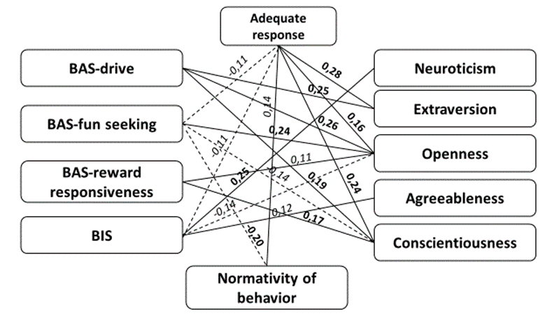 An adequate response in situations of danger is a response that fully corresponds to the nature of the threat, carried out through socially developed and approved rules of conduct for a particularly dangerous situation. According to the data obtained in this study, the adequate response is positively associated with extraversion, openness to experience, conscientiousness, and normativity of behavior, negatively – with BAS-pleasure seeking and BIS-sensitivity to negative stimuli. Consequently, people of the extroverted type, who are open to experience, observing norms and rules of behavior, conscientious with a high level of self-control, not sensitive to BAS-the search for pleasure and BIS-the reaction to negative stimuli, respond adequately to dangers more often. In other words, difficulties and dangers do not cause them to inhibit behavior but stimulate the search for an adequate way out of the situation.
