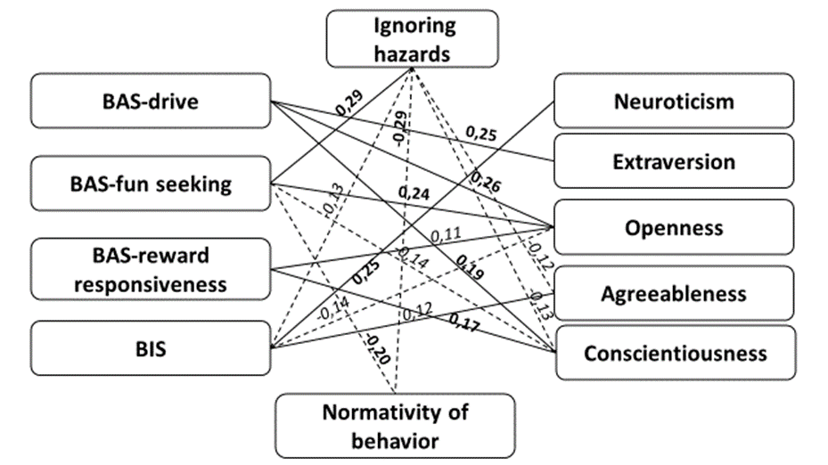 In such cases where high BAS-the search for pleasure is combined with low BIS, as well as with reduced benevolence, conscientiousness, and normativity of behavior - there will be a type of attitude to dangers that ignores with reduced sensitivity. This type makes up approximately 10% of the subjects.