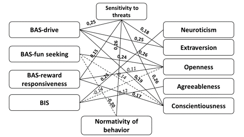 Sensitivity to threats (Figure 1) positively correlates with BAS-persistence, BAS-responsiveness to rewards, extraversion, conscientiousness, and normativity of behavior. No negative connections were found. In turn, BAS-persistence was positively associated with extraversion, and BAS-responsiveness to reward – with conscientiousness. Thus, extroverts are more often highly sensitive to threats, capable of perseverance for the sake of a goal, responsibly suited to any business, with a developed ability to control the situation and self-control, which in principle implies the concept of “sensitivity to threats”, striving to comply with the norms and rules of behavior accepted in society in various spheres of life. Accordingly, low sensitivity to threats is more evident among people who are prone to introversion, are not focused on achieving goals, do not have a sufficient level of perseverance, organization, and allow violation of generally accepted norms and rules of behavior.