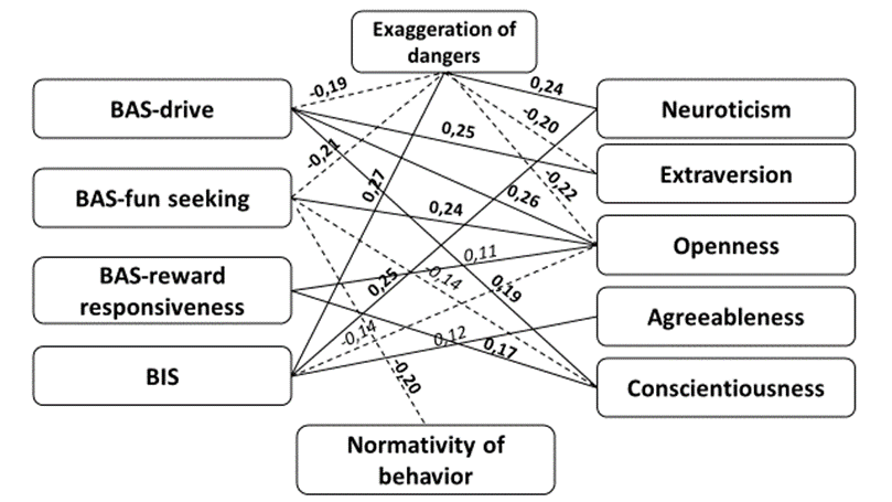 Including the normativity of behavior in the hypothesis of the study, the authors were guided by the following considerations. Norms are social rules and requirements that regulate people's behavior in various situations, that is, they determine what is appropriate or inappropriate to do in a particular case, what is allowed or prohibited for various members of the community (Kelly & Setman, 2020), and normativity of behavior is adherence to norms, that is, the degree to which a person is internally motivated to comply with them (Morris & Cushman, 2018). Special studies show that adequate behavior in situations of danger is largely determined by how much a person can follow regulatory prescriptions and rules. This can be demonstrated by the example of people's attitude to wearing masks during the COVID-19 pandemic (Kemmelmeier & Jamie, 2021). Wearing a mask (regulatory prescription) is an adequate form of response to the danger of infection with the virus, refusing to wear a mask is a clear denial. Therefore, it is logical to assume that the normativity of behavior will be more associated with the choice of adequate ways of responding than with exaggeration and understatement of dangers, as well as with BAS and BIS.