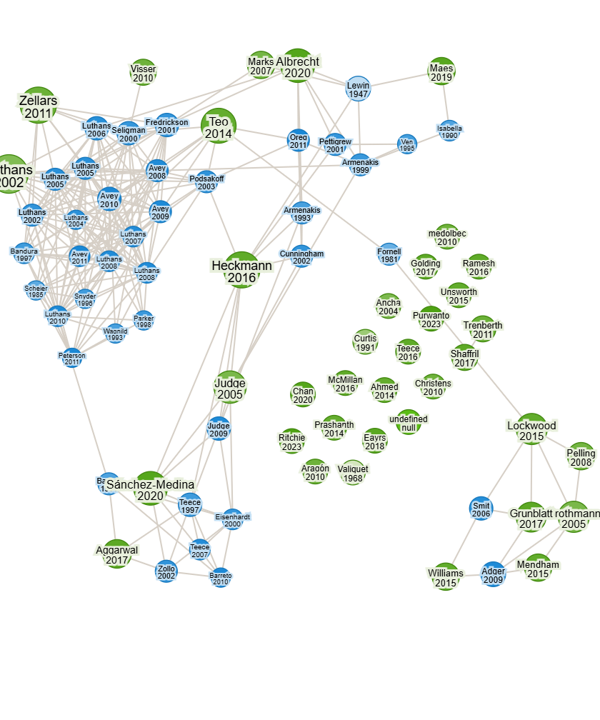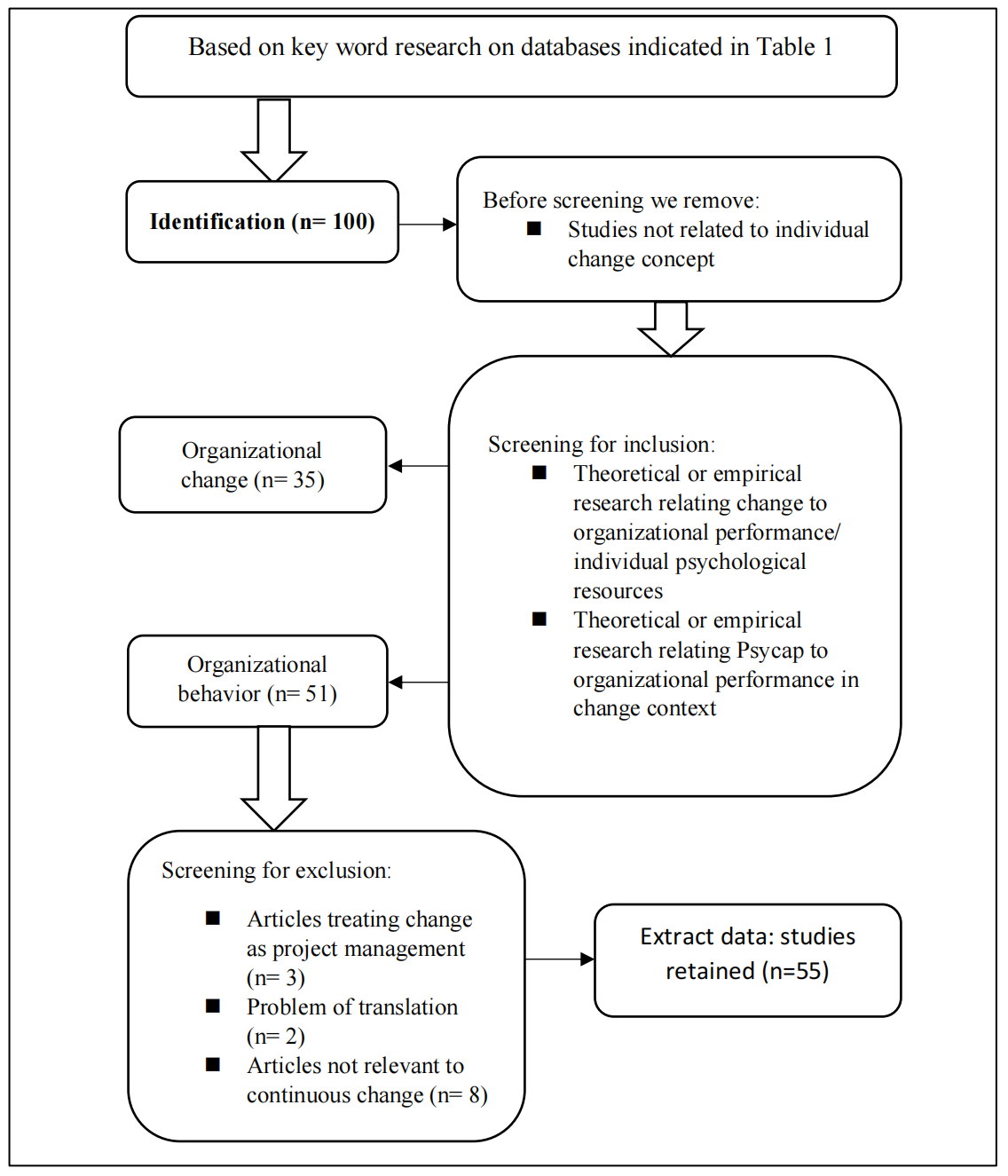 We read the abstracts of 100 references, and 86 relevant articles were collected for full-text analyses. In this step, we were in front of two categories of articles: (1) empirical or theoretical studies on psychological capital and change management (n = 25) and (2) empirical or theoretical articles on organizational change capacity and performance (n = 30).