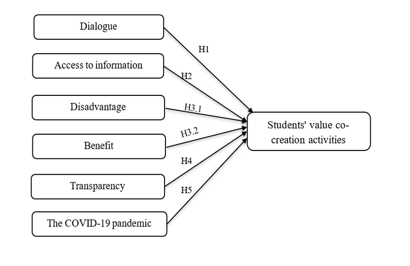 Studies on factors influencing value co-creation activities in university education remain limited. These researchers focused on examining the values and benefits of campaigns, including Schumann, Peters, and Olsen (2013); Dziewowska (2017). At the same time, current research is mostly oriented on areas requiring significant knowledge, and experience in the human body, thus the percentage of consumers participating in these activities remains low (Pham & Truong, 2018). As a result, based on inheriting and developing achievements from previous studies, the authors will concentrate on researching the factors that influence service receivers' participation in value co-creation activities. That is why the topic "Value co-creation activities of students on the Covid-19 pandemic: Empirical evidence from economics students in Vietnam" is chosen for this study.