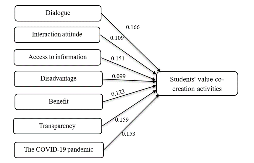 The Benefit factor with β = 0.122 has a greater impact on the activity than the Disadvantage factor (β = 0.099), and the disadvantage factor has the least impact. The majority of participants in value co-creation activities are well aware of the benefits obtained as well as the drawbacks encountered when participating in activities. Once deciding to participate in the activity, schools/enterprises, lecturers, and students must consider the benefits they will receive, which can include new teaching methods with two-way exchanges between lecturers and students, or useful knowledge and experiences for students in their future work. These advantages outweigh the disadvantages that the subjects will confront if they choose to participate in these projects. Nygaard et al. (2013); Cook-Sather et al. (2014) found similar results. Hypothesis H3.1 and H3.2 are accepted. The transparency factor has a great impact on students' value of co-creation activities in university education (β = 0.159). This finding is consistent with Prahalad and Ramaswamy (2004), which implies that transparency is a motivating factor for ending incorrect information so that participants can freely obtain data. The coefficient of the COVID-19 pandemic factor (β = 0.153) demonstrates a positive impact on the value of co-creation activities of students and H4 has been accepted as a hypothesis. The results of the analysis show that the COVID-19 pandemic has certain effects on the value of co-creation activities of students and is consistent with the study of Hassan et al. (2020). As a result, this is an excellent time for education service providers to arrange and encourage consumers to participate in new value co-creation activities, boosting the quality of their activities and ensuring their sustainability and interactivity among subjects in activities.