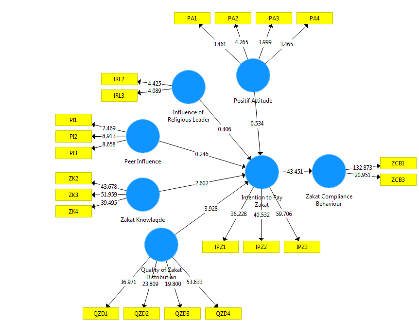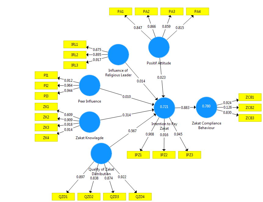 From the results of the factor loading, it was found that there were low values of several indicators (items). According to Hair et al. (2021), the recommended loading is above 0.70, although 0.50 is also acceptable, and the Average Variance Extracted (AVE) is up to 0.5. There are several indicators (items) that must be eliminated, including items IRL1, ZCB2, and ZK1, where their value is less than 0.7. Then the resulting AVE value of each variable is above 0.5. The positive attitude variable has an AVE value of 0.718, the influence of the religious leader is 0.822, intention to pay Zakat is 0.852, peer influence is 0.884, the quality of Zakat distribution is 0.780, Zakat compliance behavior is 0.771, and Zakat knowledge is 0.850. At the same time, the Cronbach's Alpha value for each variable is greater than 0.6. Composite Reliability (CR) with the value of each variable is above 0.7. Positive attitude CR is 0.910, the influence of the religious leader is 0.902, intention to pay Zakat is 0.945, peer influence is 0.958, quality of Zakat distribution is 0.934, and Zakat compliance behavior is 0.944. According to Abdillah and Hartono (2015) and Sekaran and Bougie (2013), composite reliability (CR) is acceptable with a value above 0.7. The outer model image was obtained after removing some items (Figure 3).