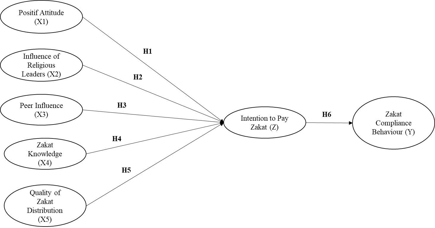 This study uses five exogenous/independent variables which are thought to have a significant impact on the endogenous/bound variable, namely compliance in paying Zakat, with the intervening variable of intention to pay professional Zakat. Based on the following hypotheses, Figure 1 is an overview of the conceptual framework as follows: